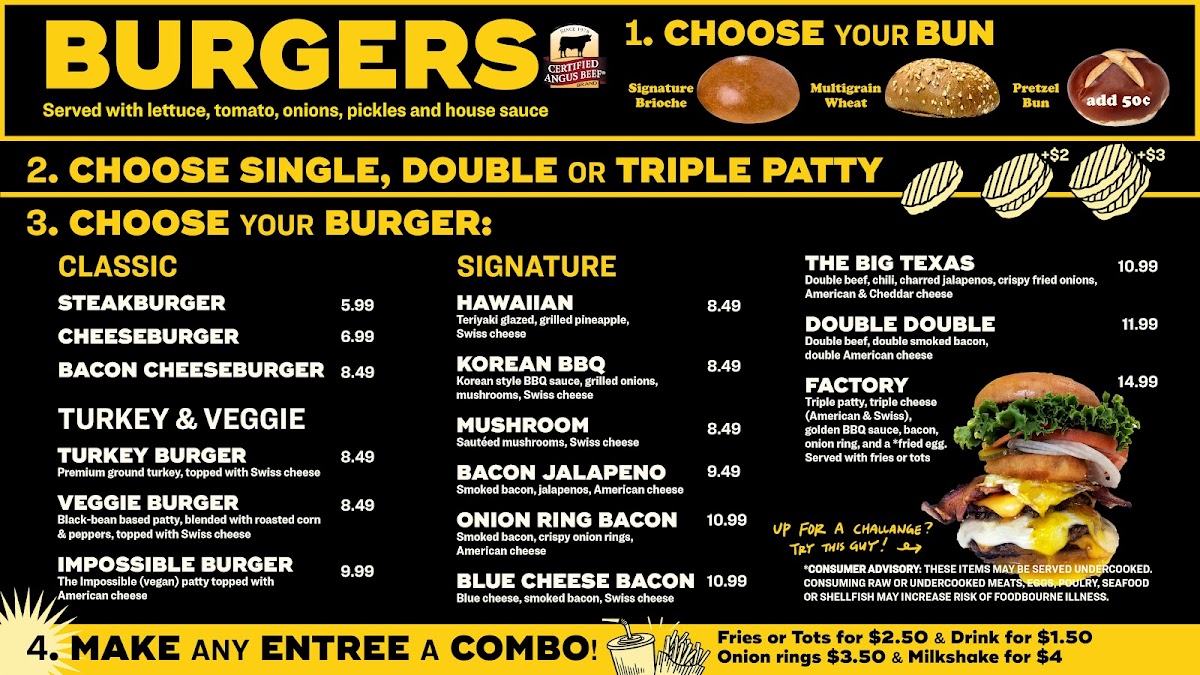 Extra Certified Angus Beef or All Natural Chicken, Spicy Korean Gochujang, mushrooms, jalapenos, onions, and cheese.